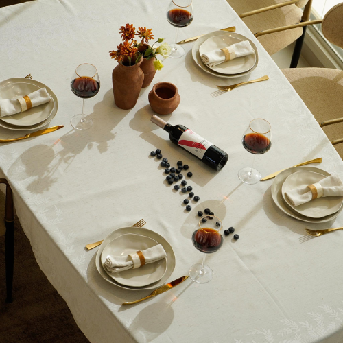 מפת שולחן ג’קארד איכותית במראה דמוי פשתן טבעי המשלב עיצוב אלגנטי וחגיגי.
